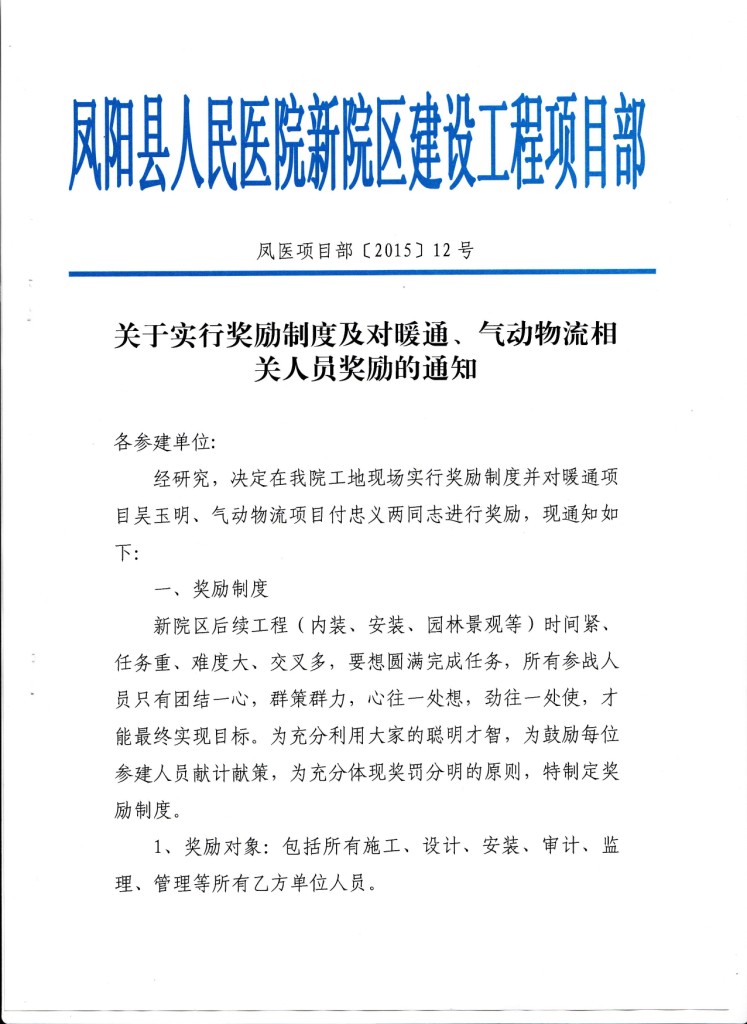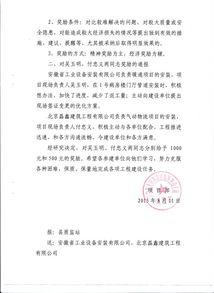 8月11日,鳳陽縣人民醫(yī)院新院區(qū)建設(shè)工程項目部發(fā)來賀文,就公司第九分公司承攬的鳳陽縣人民醫(yī)院新院區(qū)暖通項目安裝工程表示肯定,并對該項目的現(xiàn)場負(fù)責(zé)人吳玉明同志給予表彰和獎勵通報。
