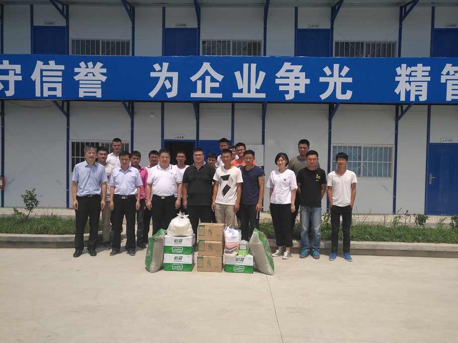 烈日炎炎,熱浪滾滾。連日來,淮北氣溫節(jié)節(jié)攀升,7月22日正值大暑時(shí)節(jié),公司董事長、總經(jīng)理王軍邦,紀(jì)委書記、工會主席李寬旭,總工程師吳繼成一行,來到淮北和諧新家園項(xiàng)目部“送清涼”,親手將一袋袋綠豆,一條條毛巾,一盒盒仁丹、清涼油,一箱箱礦泉水等防暑降溫物品,送到頂著高溫,堅(jiān)守在生產(chǎn)崗位的項(xiàng)目員工手中,給奮戰(zhàn)在一線的員工們送上沁人心脾的絲絲涼爽和無微不至的親切關(guān)懷。