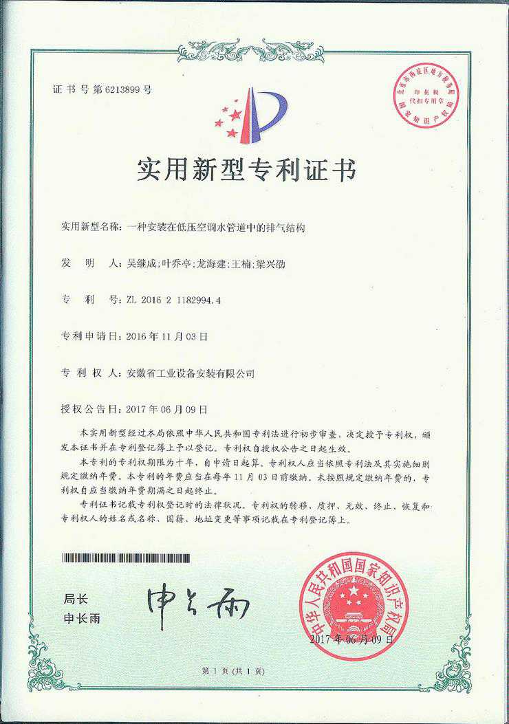 近日,由安徽安裝公司申報(bào)的《一種安裝在低壓空調(diào)水管道中的排氣結(jié)構(gòu) 》實(shí)用新型項(xiàng)目,正式獲得國(guó)家知識(shí)產(chǎn)權(quán)局授權(quán),并頒發(fā)了實(shí)用新型專利證書(專利號(hào):ZL201621182994.4)。這是繼《一種便攜式施工現(xiàn)場(chǎng)臨時(shí)用電聯(lián)排插座》之后獲得的第二項(xiàng)專利。
