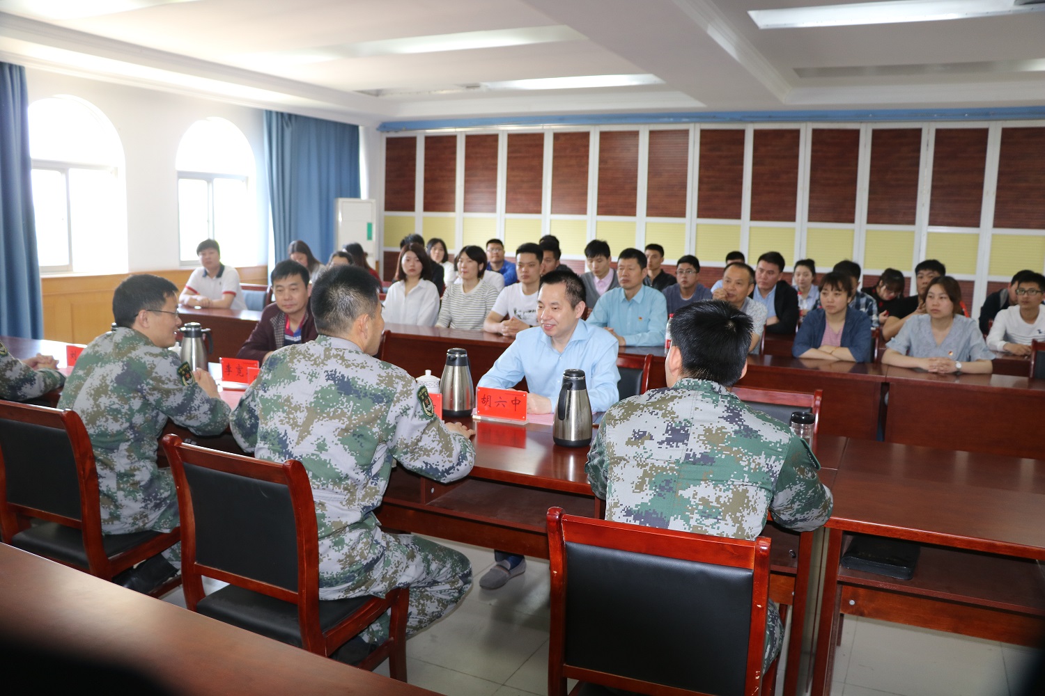 在軍地座談會(huì)上,安徽預(yù)備役師高炮團(tuán)團(tuán)長陳壽、政治處主任周玉兵、后裝處長劉春、司令部負(fù)責(zé)人凌德山出席會(huì)議,陳壽團(tuán)長對(duì)安徽安裝公司團(tuán)員青年的到來表示歡迎,并對(duì)高炮團(tuán)的基本情況進(jìn)行了簡要介紹。胡六中書記在座談會(huì)上對(duì)此次團(tuán)員青年走進(jìn)軍營學(xué)習(xí),與對(duì)方進(jìn)行了交流,他說,團(tuán)員青年正值價(jià)值觀的塑成期,此次走進(jìn)軍營,親身感受軍人的信仰、信念、紀(jì)律、本領(lǐng)和血性更是作為國有企業(yè)職工持續(xù)點(diǎn)燃愛國熱情、責(zé)任擔(dān)當(dāng)?shù)碾y得機(jī)會(huì)!