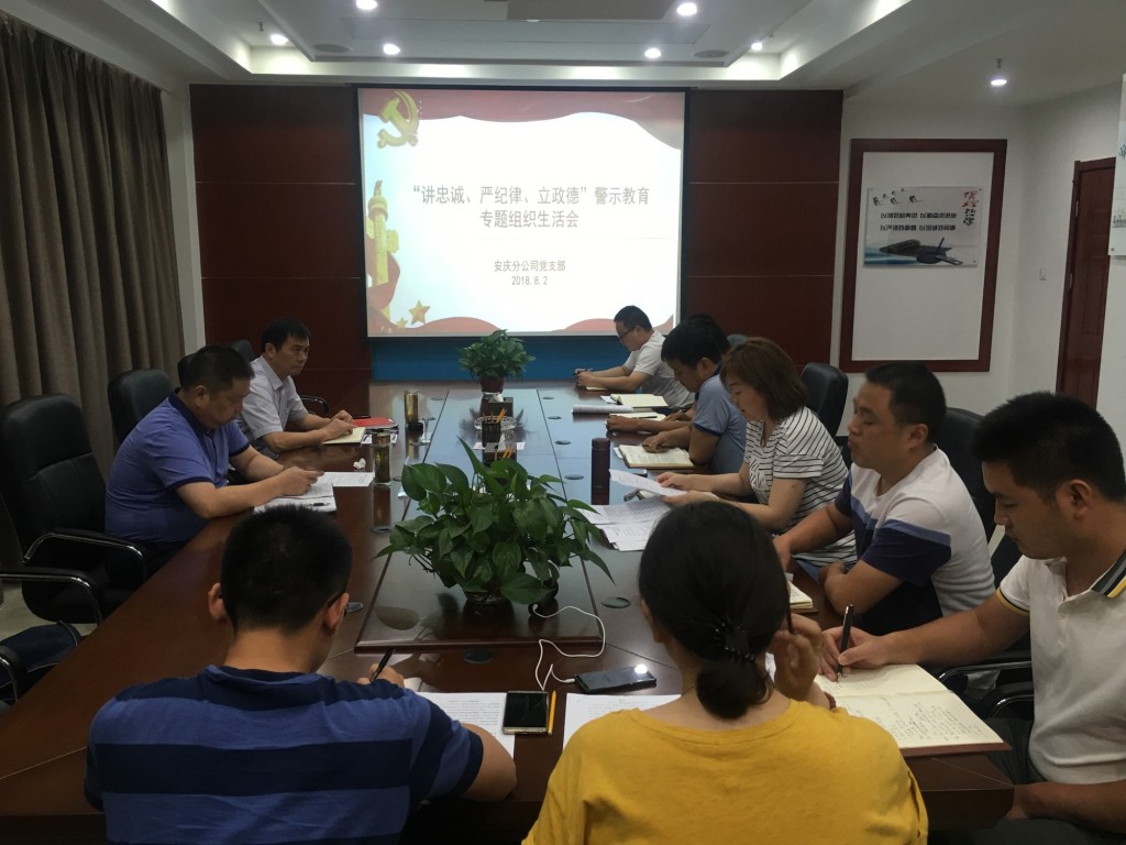 8月2日下午,安慶分公司黨支部組織召開了“講忠誠、嚴紀律、立政德”警示教育專題組織生活會,公司董事長、總經(jīng)理、黨委副書記王軍邦,紀委書記、工會主席李寬旭到會指導(dǎo)。分公司領(lǐng)導(dǎo)班子成員、支部黨員參加了會議,會議由分公司黨支部書記劉紅艷主持。