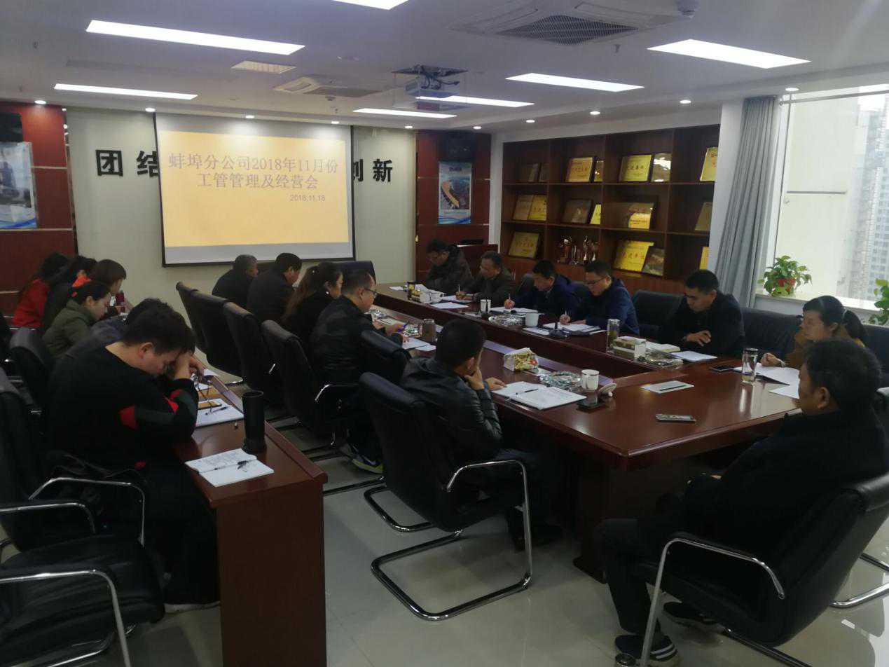 2018年11月18日下午,在蚌埠分公司會議室召開11月份工程管理及經(jīng)營工作會議。分公司領(lǐng)導(dǎo)班子成員、機關(guān)各部門負責人及項目經(jīng)理、聯(lián)營合作單位負責人參加會議,會議由分公司副經(jīng)理張漢軍主持。