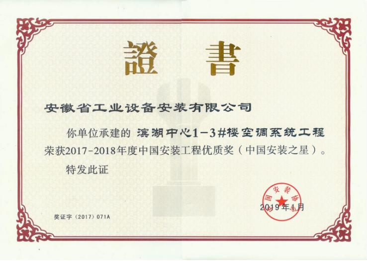 2019年4月17日,中國安裝協(xié)會在珠海召開第六屆七次理事(擴(kuò)大)會議暨工程創(chuàng)優(yōu)經(jīng)驗交流會,會上表彰了2017-2018年度中國安裝工程優(yōu)質(zhì)獎(中國安裝之星),安徽安裝承建的“合肥市濱湖中心1#-3#樓空調(diào)系統(tǒng)工程”項目榮獲該項榮譽(yù)。