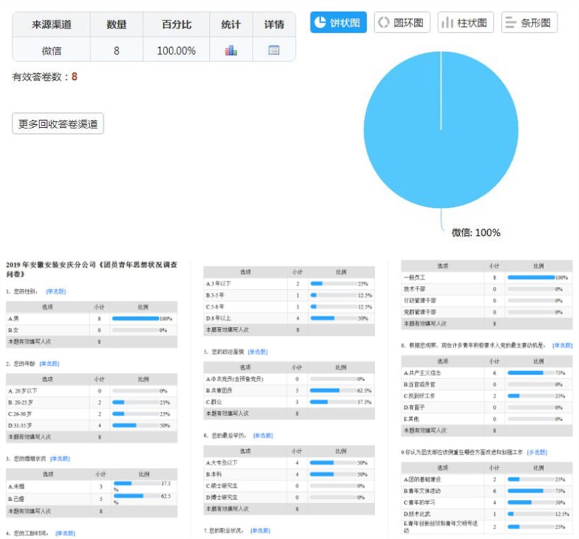 隨后,為進(jìn)一步深入了解青年員工思想、工作、生活狀況,根據(jù)新時期青年思想特點,結(jié)合分公司實際情況,團(tuán)支部利用手機(jī)微信掃碼方式在會議現(xiàn)場對每位青年員工進(jìn)行了思想狀況調(diào)查。團(tuán)支部將根據(jù)統(tǒng)計分析報告,針對大家所需所想,廣泛開展形式多樣、內(nèi)容豐富的集體活動。