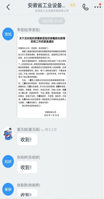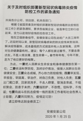 二是部署到位。疫情防控工作開展后,1月25日(大年初一)安徽安裝公司發(fā)出防控疫情工作的緊急通知,1月27日制定肺炎疫情防控措施,對疫情防控工作進行細化安排,周密部署。要求各分公司、直屬項目部、各部門要以對職工群眾生命安全高度負責的態(tài)度,精準施策,堅決遏制疫情在安徽安裝公司輸入、蔓延,鼓勵職工戴口罩、勤洗手、多通風、少走動、常消毒。