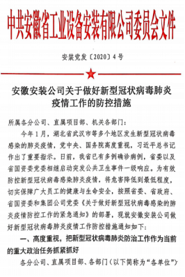 一是組織到位。1月26日,安徽安裝公司下發(fā)《關于成立新型冠狀病毒感染肺炎疫情防控工作領導小組的通知》,負責貫徹落實上級關于新型冠狀病毒感染肺炎疫情防控工作的重大決策部署,負責安徽安裝公司新型冠狀病毒感染肺炎疫情防控工作的領導,研究解決安徽安裝公司疫情防控中的重大問題,統(tǒng)籌組織防控處置。