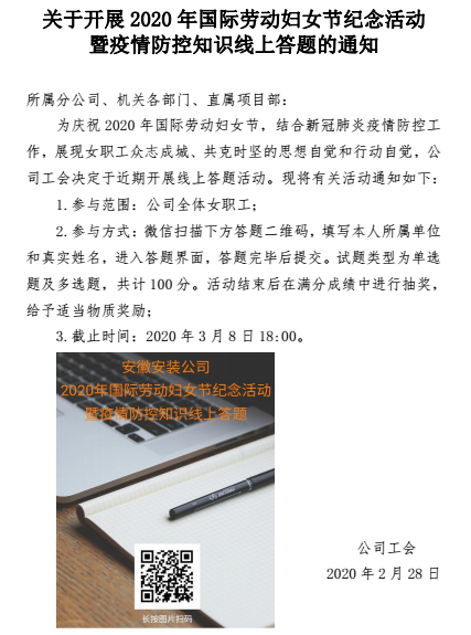 鑒于當(dāng)前新冠肺炎疫情防控特殊時(shí)期,本著不聚集、少聚集的原則,安徽安裝公司工會組織全公司八十多名女職工參加了疫情防控和《婦女權(quán)益保障法》等知識的學(xué)習(xí),利用微信平臺開展了線上答題活動(dòng),活動(dòng)一推出,廣大女職工立即響應(yīng),熱情高漲,對于不太清楚的問題,主動(dòng)查閱相關(guān)資料,與身邊的同事討論,對模棱兩可的問題,仔細(xì)斟酌精確作答。通過此次答題活動(dòng),全公司范圍內(nèi)再一次掀起宣傳疫情防控常識的熱潮,推動(dòng)公司疫情防控工作的開展,也進(jìn)一步普及了新時(shí)期下女職工的合法權(quán)益。答題活動(dòng)結(jié)束后,對優(yōu)秀成績給予獎(jiǎng)勵(lì)。