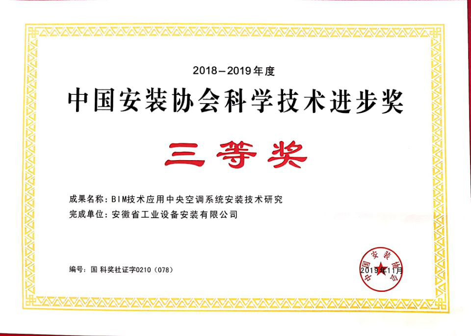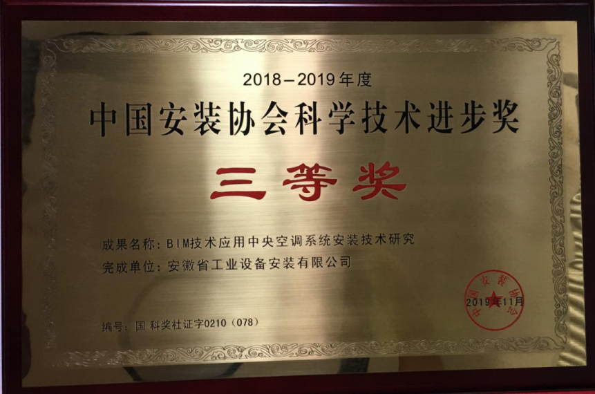 由安徽安裝公司主持研究的《BIM技術(shù)應(yīng)用中央空調(diào)系統(tǒng)安裝技術(shù)研究》項目榮獲“2018-2019中國安裝協(xié)會科學(xué)技術(shù)進(jìn)步獎”三等獎榮譽(yù)。受疫情影響,該獎牌及證書于8月15日下發(fā)。