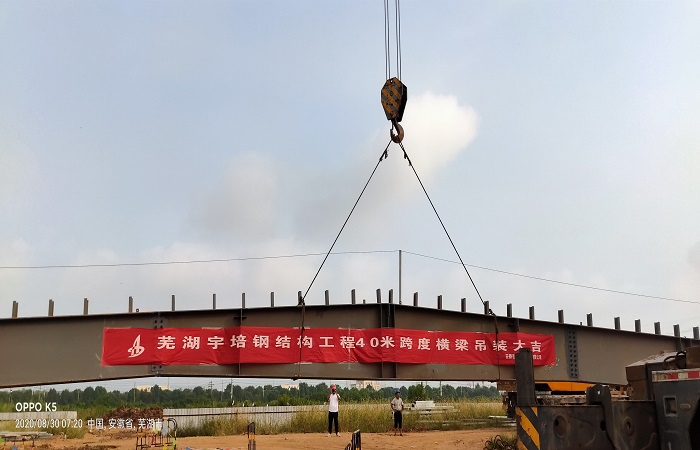蕪湖宇培鋼結(jié)構項目露天跨部分為現(xiàn)場整體廠房連接點,同時也是連接PC1/PC2兩個廠房大跨度橫梁結(jié)構核心區(qū),包括21拼大跨度橫梁,此橫梁為蕪湖宇培項目鋼結(jié)構工程中重量最大的鋼構件,長度約為40米,最大寬度達1.5米,重量約10噸。露天跨部分的吊裝作業(yè),是本項目難度最大,精度要求最高的一項工程,特別是吊裝完善后橫梁與PC2號廠房的連接點采用高強螺栓連接,而另一端與PC1號廠房采用焊接擋板滾軸式連接,每跨橫梁在后期達到可以移動的效果。