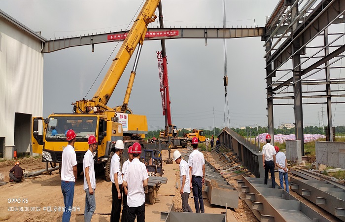 伴隨著現(xiàn)場人員緊張而又激動的心情,第一拼40米大跨度的重型橫梁徐徐升起,并精準吊裝就位,這意味著經(jīng)過100多天的奮戰(zhàn)后,蕪湖項目鋼結(jié)構工程跨越了施工難度節(jié)點和取得了階段性突破,同時標志著該項目鋼結(jié)構工程最后的主體完工已邁出至關重要的一步。