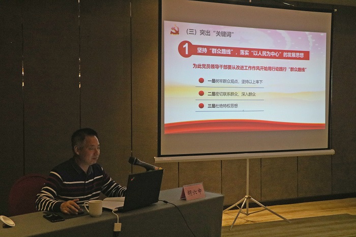 胡六中在報告中帶領(lǐng)大家共同回顧了習(xí)近平總書記考察安徽行程路線和重要講話精神,他指出,總書記在考察中多次提到“要牢固樹立以人民為中心的發(fā)展思想”“要踐行黨的宗旨,樹牢群眾觀點(diǎn)”“要多謀民生之利、多解民生之憂”,全體黨員領(lǐng)導(dǎo)干部一要從改進(jìn)工作作風(fēng)開始用行動踐行“群眾路線”,落實“以人民為中心”的發(fā)展思想;二要堅持“黨管干部”,全面深化干部制度改革;三要堅持“一體化”和“高質(zhì)量”,推動黨建與生產(chǎn)經(jīng)營深度融合。