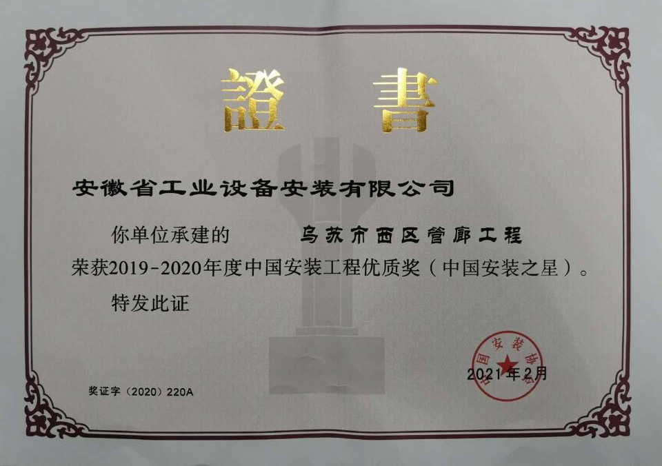 大會(huì)頒發(fā)了2019-2020年度中國(guó)安裝工程優(yōu)質(zhì)獎(jiǎng)(中國(guó)安裝之星)獲獎(jiǎng)工程。我公司承建的烏蘇市西區(qū)管廊工程榮獲“中國(guó)安裝之星”中國(guó)安裝工程優(yōu)質(zhì)獎(jiǎng)。胡六中董事長(zhǎng)被授予 “中國(guó)安裝工程優(yōu)質(zhì)獎(jiǎng)工程企業(yè)領(lǐng)導(dǎo)人”特別榮譽(yù),康永軍經(jīng)理被授予“中國(guó)安裝工程優(yōu)質(zhì)獎(jiǎng)工程項(xiàng)目經(jīng)理”特別榮譽(yù)。