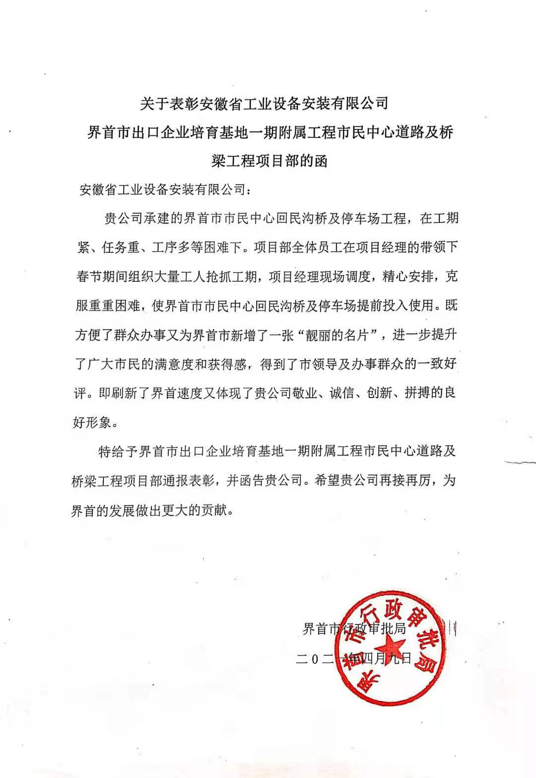 為此,界首市行政審批局發(fā)來表彰函,表彰界首市出口企業(yè)培育基地一期附屬工程市民中心道路及橋梁工程項目部在工程任務(wù)中的優(yōu)秀表現(xiàn),相信項目部全體人員會一如既往秉持“團(tuán)結(jié)、拼搏、求實、創(chuàng)新”的企業(yè)精神,繼續(xù)努力,為城市的建設(shè)、企業(yè)的發(fā)展作出更大的貢獻(xiàn)!