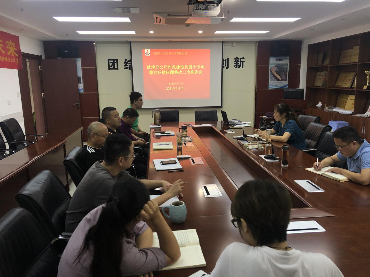 9月15日上午,蚌埠分公司黨支部召開“作風(fēng)建設(shè)及四個專項整治反饋問題整改二次推進會”。分公司支委委員、班子成員、工管部、財務(wù)部、經(jīng)營部、綜合辦等相關(guān)部門負(fù)責(zé)人、具辦人員參加會議,會議由黨支部書記程茂麗主持。