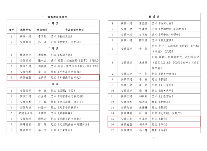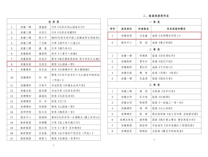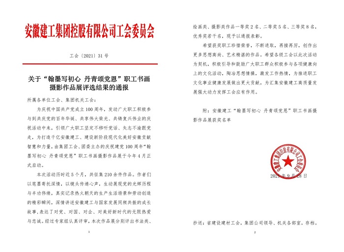 9月29日,集團(tuán)公司工會通報了“翰墨寫初心 丹青頌黨恩”職工書畫攝影作品展評選結(jié)果,安徽安裝公司選送的五幅作品榜上有名。其中馬金鑫的油畫作品《支部建在項目上》榮獲繪畫類一等獎,任禹豪的攝影作品《幸福是干出來的》榮獲攝影類二等獎,化范寶的硬筆書法作品《沁園春·雪》和程茂麗的攝影作品《攀登》、胡欣欣的攝影作品《齊心》分別榮獲書法類優(yōu)秀獎和攝影類優(yōu)秀獎。