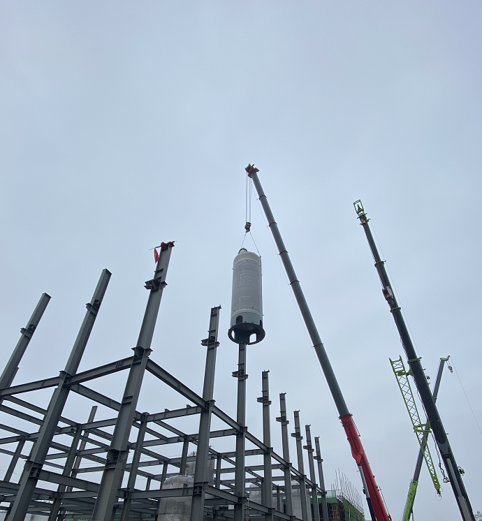 十余噸的罐體在吊車的牽引下緩緩升起,小心翼翼,精準前往指定基礎,施工人員進行固定矯正...30多臺工業(yè)用罐就這樣矗立起來。