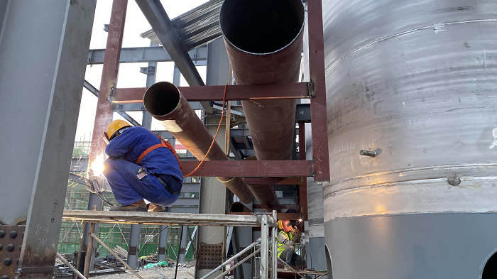 工藝管道班組也在忙忙碌碌,壓縮空氣管道在不斷架設,料場加工好的管道在吊車、葫蘆的牽引下就位,專業(yè)的焊工進行焊接,慢工出細活,保證每一道焊口符合規(guī)范要求,室外的循環(huán)水管也在與老廠的接口緊張對接。