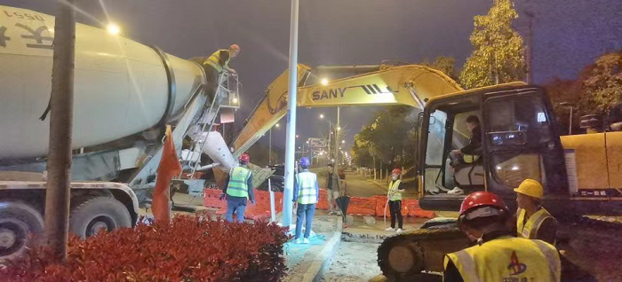 花園大道項(xiàng)目部為保證了白天道路正常通行不受影響,項(xiàng)目全體員工晚間加班加點(diǎn)進(jìn)行過路段管道施工