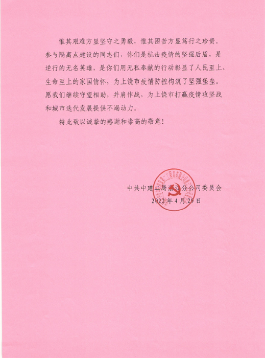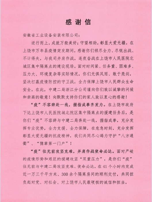信中對(duì)安徽安裝公司與中建二局浙江分公司共同援建上饒市人民醫(yī)院北城區(qū)集中隔離點(diǎn)給予高度的肯定和認(rèn)可。當(dāng)前,新冠疫情形勢(shì)嚴(yán)峻,安徽安裝公司在嚴(yán)格落實(shí)屬地疫情防控措施的同時(shí),一方面積極參與本地區(qū)隔離點(diǎn)、醫(yī)院發(fā)熱門(mén)診的緊急建設(shè)任務(wù);另一方面攜手相關(guān)行業(yè)兄弟單位同心協(xié)力、援建市外防疫區(qū)域,承擔(dān)起國(guó)有企業(yè)社會(huì)責(zé)任,竭盡所能地為防疫建設(shè)貢獻(xiàn)最大的力量!