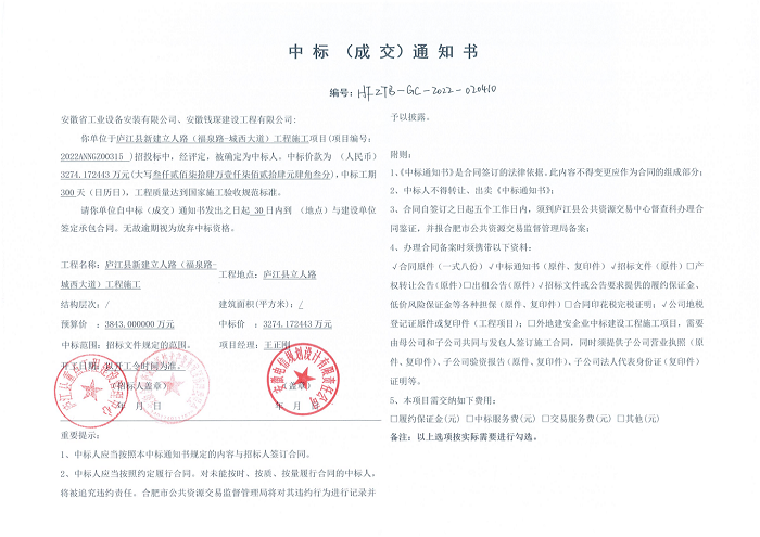 2022年8月12日,安徽安裝市政分公司在合肥市公共資源交易平臺(tái)上以聯(lián)合體牽頭人身份投標(biāo)廬江縣新建立人路(福泉路-城西大道)工程施工項(xiàng)目并一舉中標(biāo)!該項(xiàng)目是連接廬江縣福泉路與城西大道之間的道路,總長約1250米,規(guī)劃為雙向四車道,道路等級(jí)為次干路,設(shè)計(jì)時(shí)速40km/h;主要施工內(nèi)容有道路工程、排水工程、綠化工程、照明工程、交通(土建)以及其他附屬工程等,中標(biāo)金額3274.17萬元。