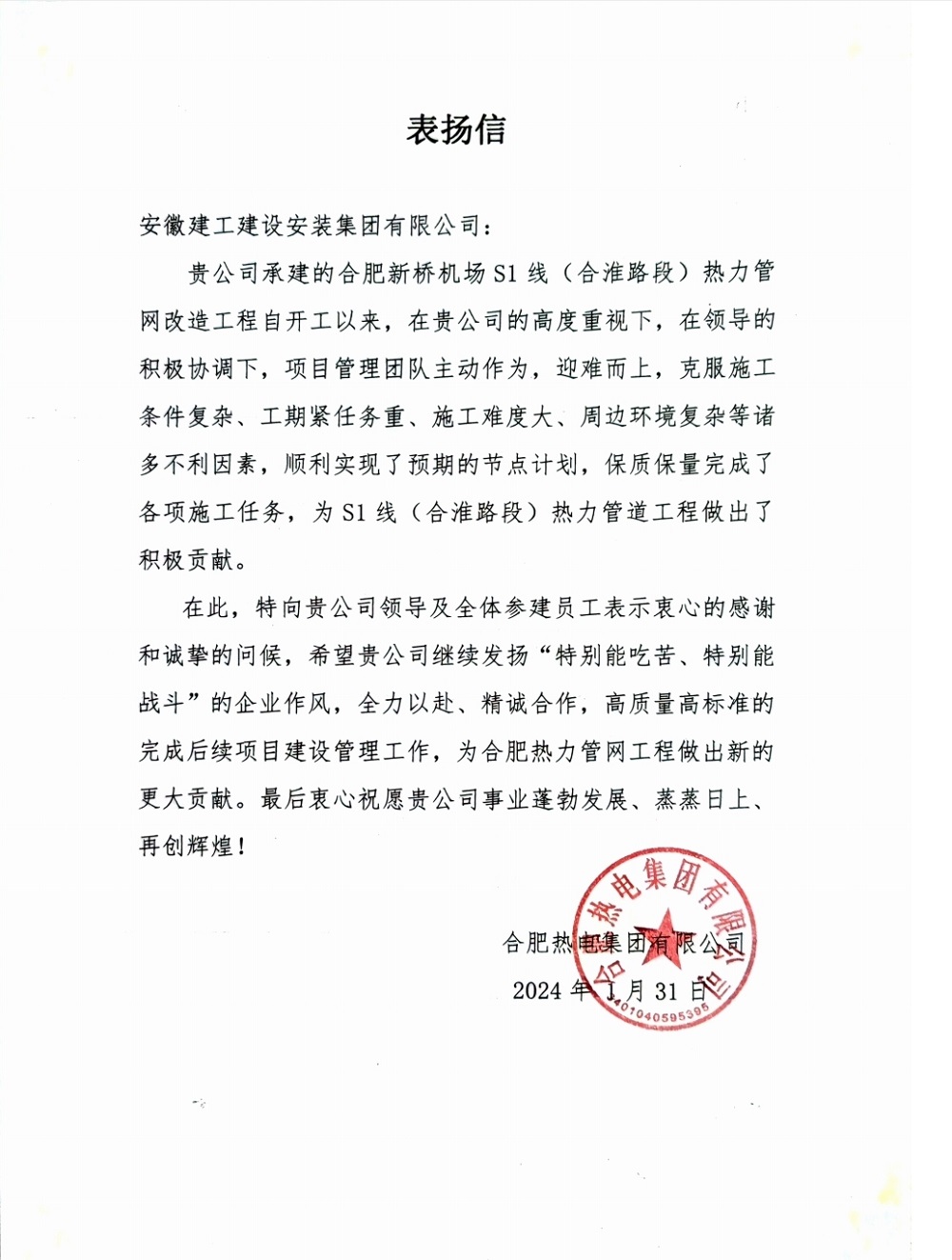 1月31日,合肥熱電集團(tuán)有限公司發(fā)來表揚(yáng)信,就建工安裝集團(tuán)對合肥新橋機(jī)場S1線(合淮路段)熱力管網(wǎng)改造工程做出的積極貢獻(xiàn)予以充分肯定和真摯謝意。