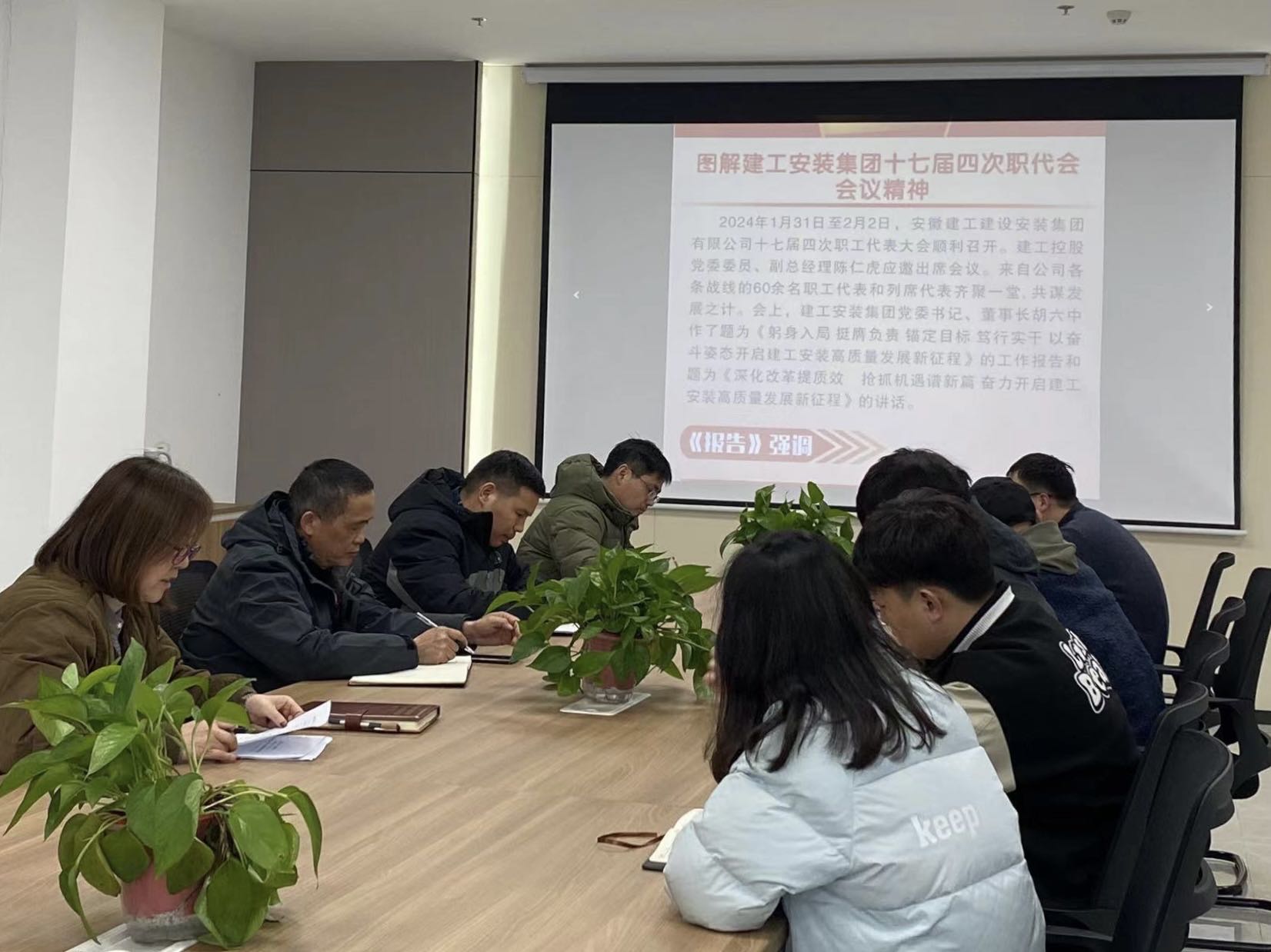 為貫徹建工控股三屆一次職代會暨2024年工作會議精神和建工安裝第十七屆四次職工代表大會精神,3月4日下午,建工安裝新能源分公司及時召開全體職工會議,認真?zhèn)鬟_會議精神。分公司在滁全體員工參會,會議由分公司黨支部書記劉紅艷主持。