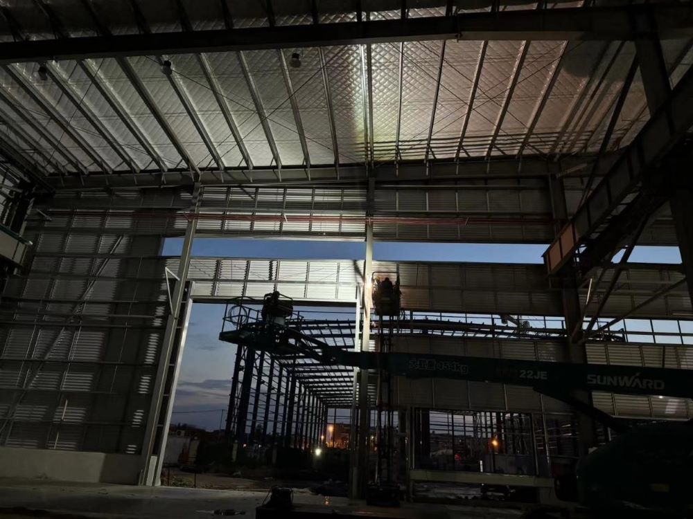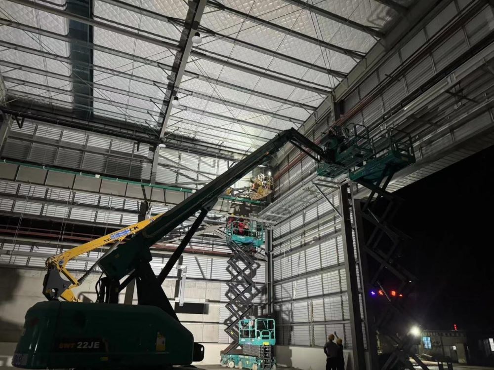 建工安裝合肥分公司施工內(nèi)容涉及2#重鋼車間主次構安裝、圍護系統(tǒng)、門窗、防火涂料、通風氣樓和機電安裝工程(裝飾裝修、工藝管線、消防、給排水、電氣、通風空調(diào)等)。為保質(zhì)保量完成施工任務,分公司派駐分管領導現(xiàn)場駐點,項目管理團隊日夜跟進,施工人數(shù)達到100多人,曲臂車、登高車等各種現(xiàn)場施工機械達60余輛。本項目留給機電安裝工期緊任務重,項目全體人員日夜奮戰(zhàn),最終刷新15日大面完工耀眼戰(zhàn)績,為基地順利投產(chǎn)奠定堅實基礎。
