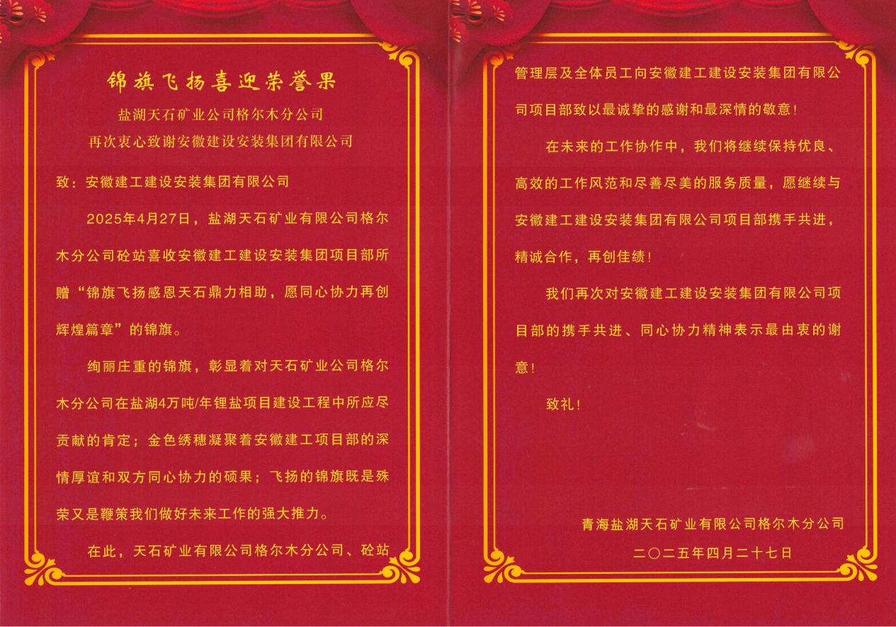 信中,青海鹽湖天石礦業(yè)有限公司格爾木分公司對建工安裝項目部此前慰問砼站全體員工致以最誠摯的感謝,愿繼續(xù)與建工安裝項目部攜手共進、精誠合作、再創(chuàng)佳績!這封感謝信不僅是對項目部過往成績的肯定,更是一份振奮人心的激勵。建工安裝將繼續(xù)保持高昂斗志和嚴謹態(tài)度,加強與相關單位溝通協(xié)作,強化項目管理,確保項目按期、高質量交付,為打造世界級鹽湖提鋰產業(yè)基地貢獻力量!