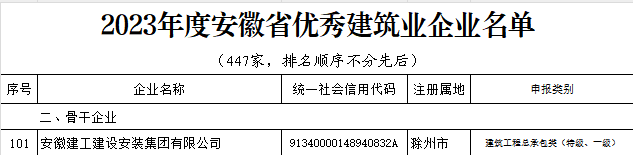 近日,安徽省住房和城鄉(xiāng)建設(shè)廳、安徽省交通運(yùn)輸廳、安徽省水利廳、安徽省通信管理局聯(lián)合發(fā)布《關(guān)于公布2023年度安徽省優(yōu)秀建筑業(yè)企業(yè)名單的通知》(建辦〔2025〕41號),安徽建工建設(shè)安裝集團(tuán)有限公司入選“2023年度安徽省優(yōu)秀建筑業(yè)企業(yè)”。